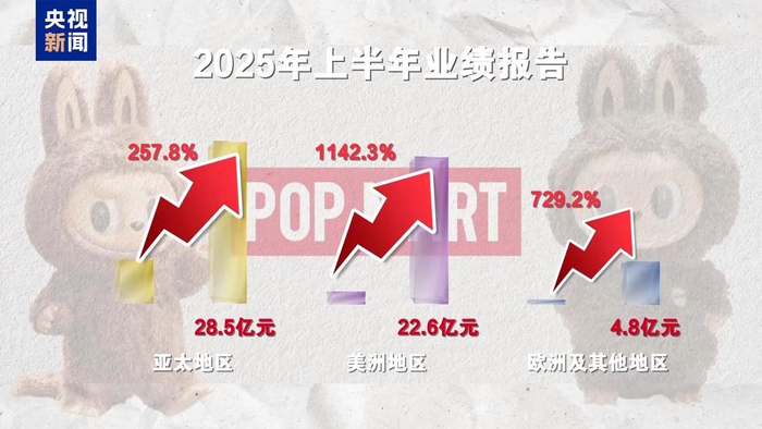根据泡泡玛特8月发布的2025年上半年业绩报告,亚太地区营收28.5亿元,同比增长257.8%;美洲地区营收22.6亿元,同比增长1142.3%;欧洲及其他地区营收4.8亿元,同比增长729.2%。