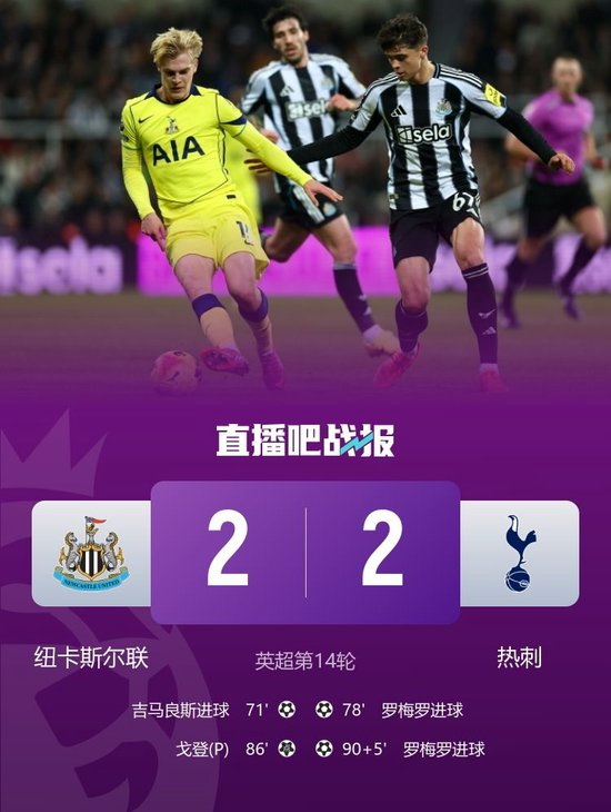 直播吧12月3日讯 北京时间12月3日04:15,英超联赛第14轮热刺挑战纽卡的比赛在圣詹姆斯公园球场进行,上半场乔林顿低射中柱,贝里瓦尔蝎子摆尾式打门造险,下半场巴恩斯失单刀,丹索门线解围,沃尔特马德助攻吉马良斯抽射打破僵局,库杜斯助攻罗梅罗头球扳平,本坦库尔送点,戈登点射破门,罗梅罗倒钩绝平,最终热刺2-2纽卡五轮不胜。
