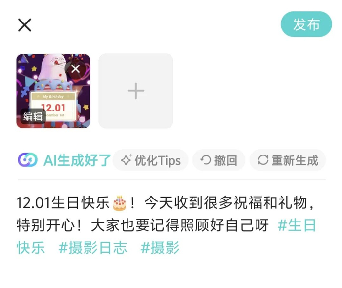 在发帖环节,用户上传照片或视频后,AI大模型会自动生成文案并且加上话题,如果不合适还支持优化tips、重新生成。