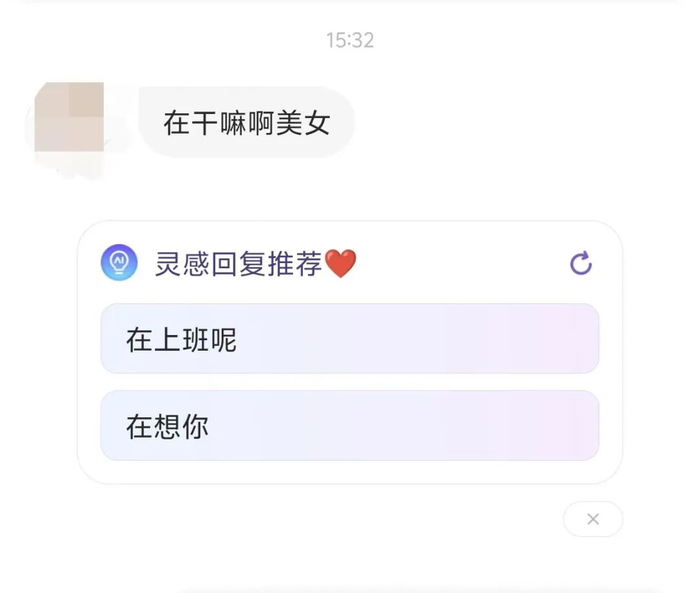 小编刚注册的新号,一上线就接收到了陌生人的消息,AI大模型给我推荐了两种回复“在上班呢”“在想你”。