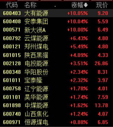 具体来看,煤炭板块集体拉升,大有能源、安泰集团、新大洲A涨停。