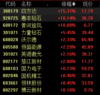 超硬材料逆势走强,黄河旋风涨停,四方达涨超15%,力量钻石、沃尔德等跟涨。