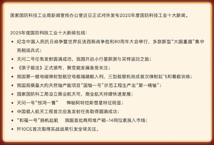 #歼10CE实战击落多架战机自己无损失#[国防科技工业局:去年5月我国外销战机歼10CE首次取得实战战果,空战中击落多架战机,自己无一损失]#去年5月外销歼10CE首次取得实战战果#国家国防科技工业局新闻宣传办公室近日正式对外发布2025年度国防科技工业十大新闻,其中一则新闻是《歼10CE首次取得实战战果引发全球关注》。