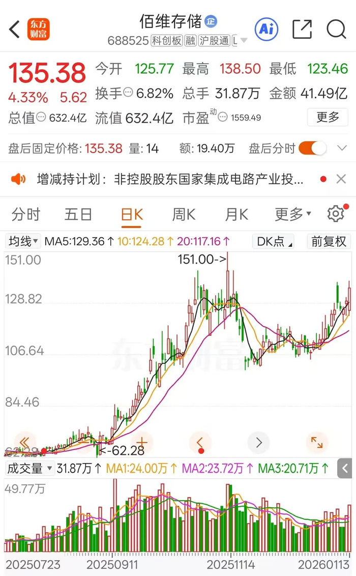股价表现方面,自2025年9月5日启动新一轮反弹行情以来,佰维存储的股价累计涨幅为113%,公司最新市值报632亿元。