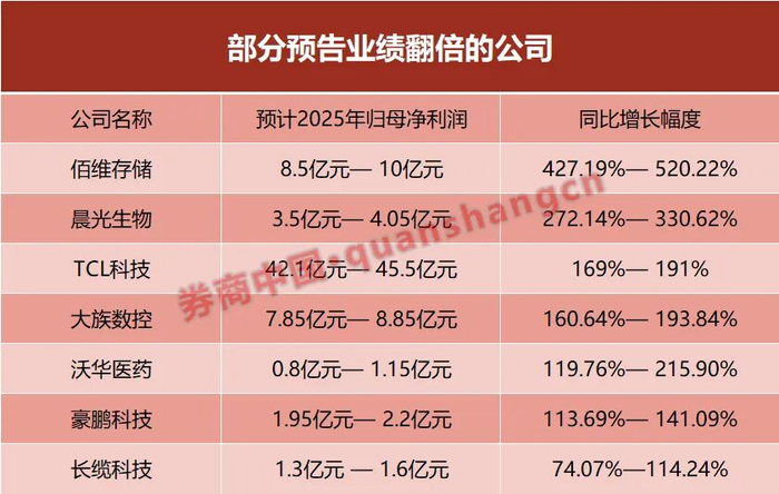 1月13日晚间,预计2025年净利同比大幅增长的公司还有晨光生物、TCL科技、大族数控、沃华医药、豪鹏科技等。