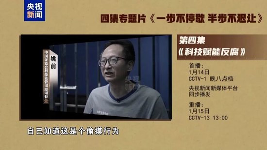 1月14日晚8点,总台央视综合频道将播出电视专题片《一步不停歇 半步不退让》第四集《科技赋能反腐》,讲述纪检监察机关丰富防治新型腐败和隐性腐败有效办法,以信息化赋能正风反腐,充分运用科技手段精准发现不正之风和腐败问题线索、迅速有效突破案件,着力提升智慧反腐、科技反腐水平。