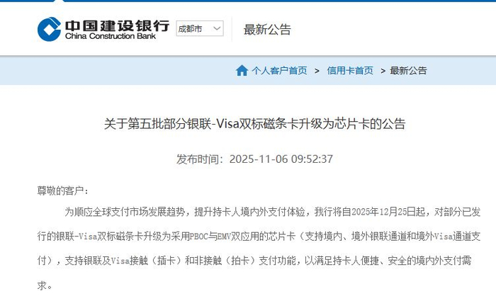 去年以来,银联-Visa双标卡“磁升芯”在多家银行启动。例如,建设银行宣布自2025年12月25日起,对部分银联-Visa双标磁条卡升级为芯片卡;中国银行也在去年“双11”当天推出银联-Visa双标信用卡升芯有礼活动。