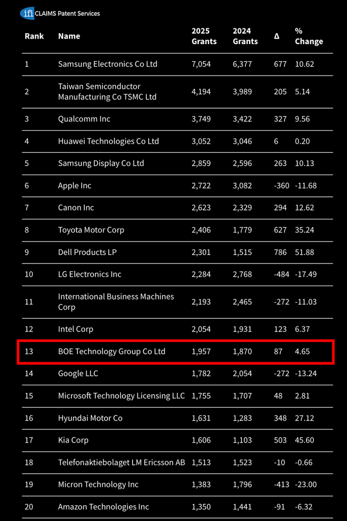 2026年1月13日, 全球权威专利服务机构IFI Claims最新发布的2025年度统计报告显示,BOE(京东方)位列美国专利授权排行榜全球第13位,连续第8年稳居全球TOP20阵营,更是TOP20中唯一一家中国显示企业。
