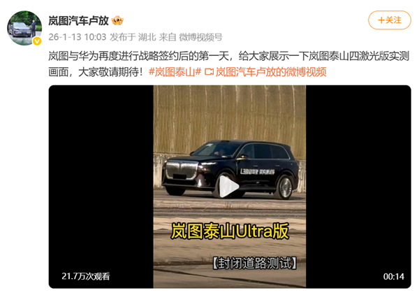 这段视频的发布于岚图与华为再度达成深化战略合作后的首日,测试过程中,车辆搭载的四激光雷达系统全程稳定工作,精准捕捉道路环境信息,视频画面清晰展示了测试车在封闭道路场景下的自主行驶状态。