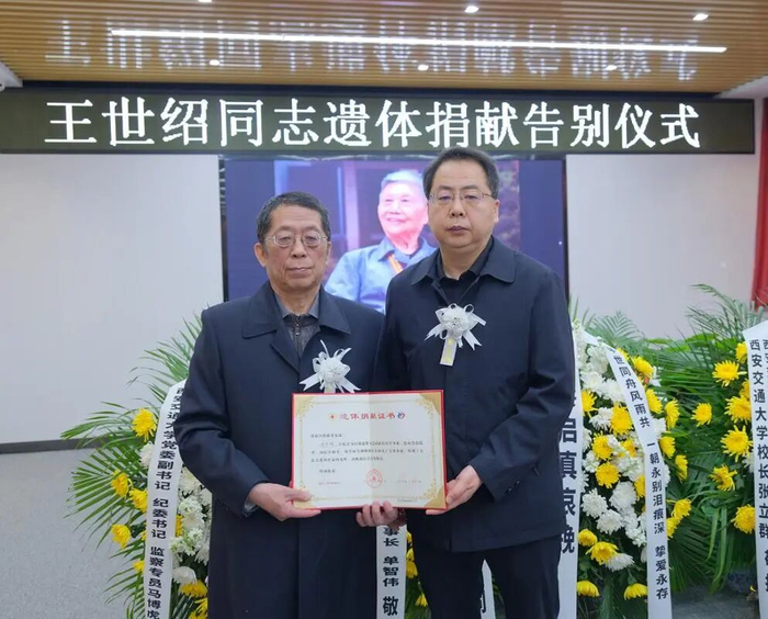 遵照王世绍同志生前遗愿,将遗体无偿捐献给西安交通大学医学部用于医学教学,王世绍同志用生命的最后一份力量,为医学人才培养和学科发展作贡献,完成了跨越生死的大爱传承。